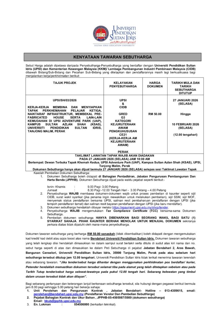 KERJA-KERJA MEMBINA DAN MEYIAPKAN TAPAK PERKHEMAHAN PELAJAR KETIGA, NAIKTARAF INFRASTRUKTUR, MEMBEKAL PRE-FABRICATED HOUSE SERTA LAIN-LAIN KEMUDAHAN DI UPSI ADVENTURE PARK (UAP), KAMPUS SULTAN AZLAN SHAH (KSAS), UNIVERSITI PENDIDIKAN SULTAN IDRIS, TANJONG MALIM, PERAK